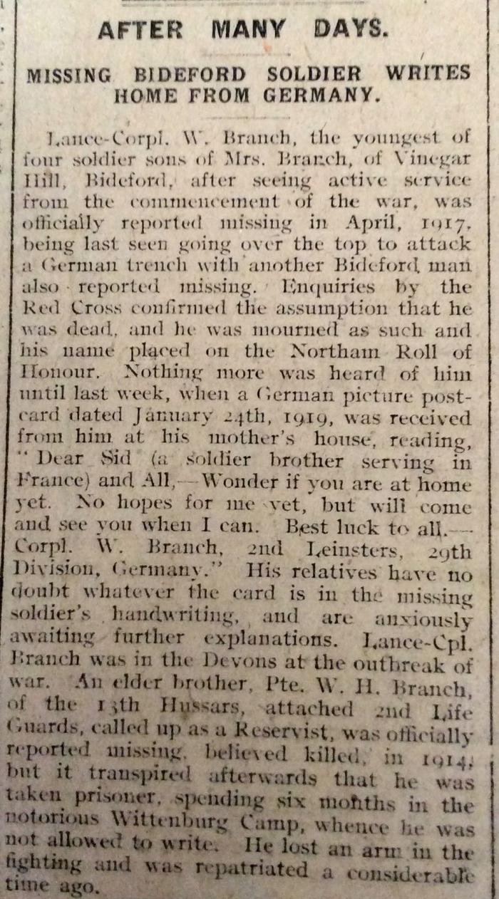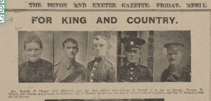 The picture of the family is from The Devon and Exeter Gazette April 16th 1915. It reads Mrs Branch of Vinegar Hill Bideford and her four soldier sons. Private S Branch is in the 1st Devons, Trooper W Branch Life Guards is aprisoner in Germany,Pte J Branch has died of wounds received in action, and Pte W Branch is with the 1st Devons. (Names not in picture order)