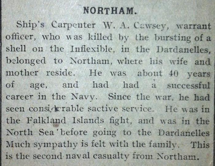 William was the son of the late Arthur and Elizabeth Cawsey; of 4 Searle Terrace Northam. 1911 Census Husband of Gertrude Cawsey of 'Hols House' Stratton Cornwall.