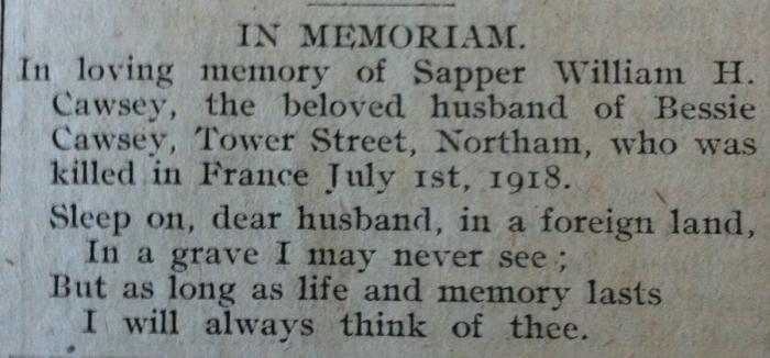 William was the son of Thomas and Susan Cawsey of 40 Clifton St Bideford,and husband to Bessie Cawsey. In the1911 Census William and Bessie were living with her mother Elizabeth Blackford in Tower street Northam. His occupation is recorded as a Mason