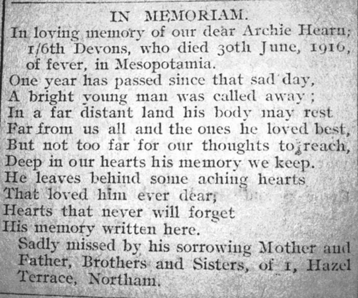 Cousin to Arthur Hearn also lost July 11th 1916 aged 28