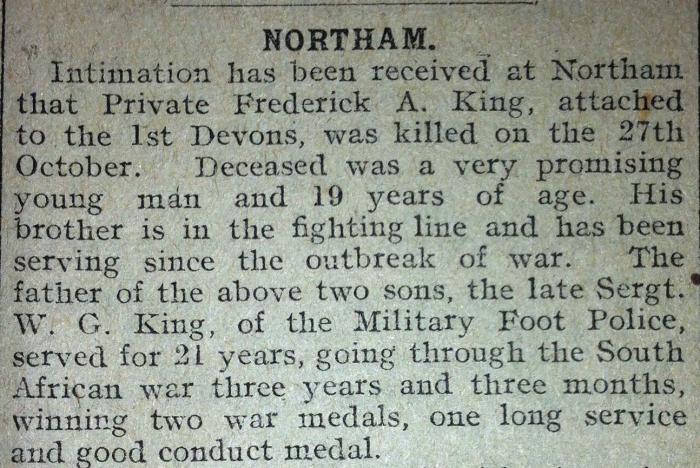 Frederick was born in Devonport but lived in Bideford and Barnstaple before WW1. He was the son of Martha and the late George William King.