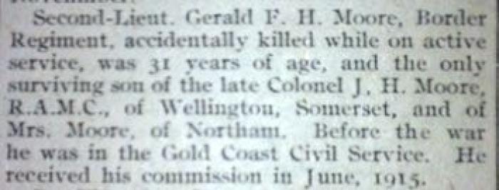 Bideford Gazette reports that Gerald was accidently Killed while on active service. It indicates that in 1917 his Mother was living in Northam Devon. Residence yet to be confirmed.