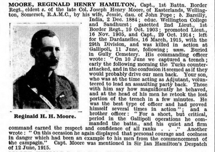 Son of the late Col.Joseph H Moore (R.A.M.C.) and Mrs Jesse E Moore formerly of "Easterlands Wellington Somerset (1911 Census) Elder Brother to Gerald who was lost Aug 12th 1917