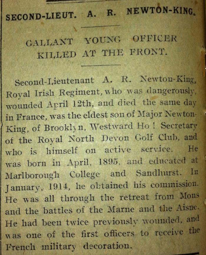 Son of MajorAlexander Coote Newton King and Mrs Katherine Newton-King,of "Brooklyn" Westward Ho! Devon