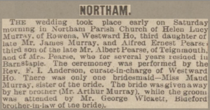 Husband of Helen Lucy Pearse of "Rowena" Westward Ho! Devon.