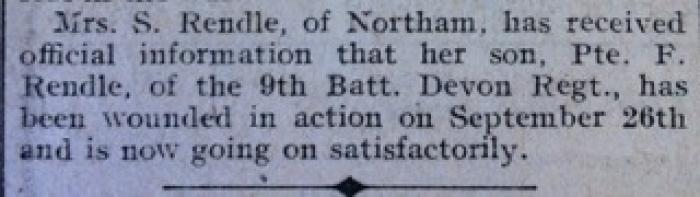 Robert was the son of William and Laura Rendle of 'Five Elms' Northam. 1911 Census. (Diddywell Road Now Demolished a new property now built on the site) Robert had been previously wounded on the 26th of September 1915